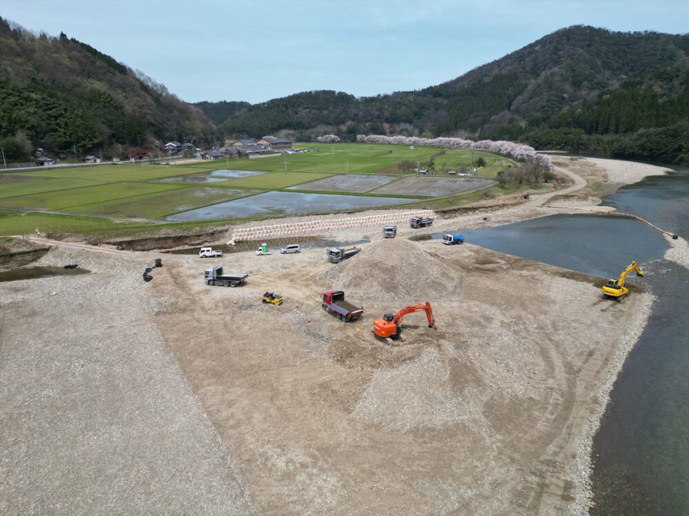 ブロック張工(1,132㎡)および平ブロック張工(1,178㎡)を施工。また、堆積した土砂2,500㎥の大規模な掘削と、245個以上の大型土のう設置を迅速かつ正確に実施しました。出水期を避けての施工であり、冬季には最大で太ももまで雪が積もる厳しい施工環境でしたが、現場監督や作業員、協力会社の皆様のおかげで地域の皆様が安心して暮らせる強靭な河川環境の再生に貢献することが出来ました。