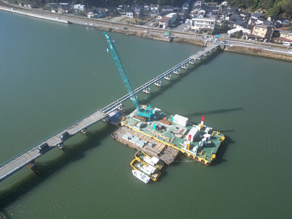 本工事は、老朽化した既設橋梁の撤去を目的とした工事で、当社はクレーン付き台船の運航・係留管理を担当いたしました。
