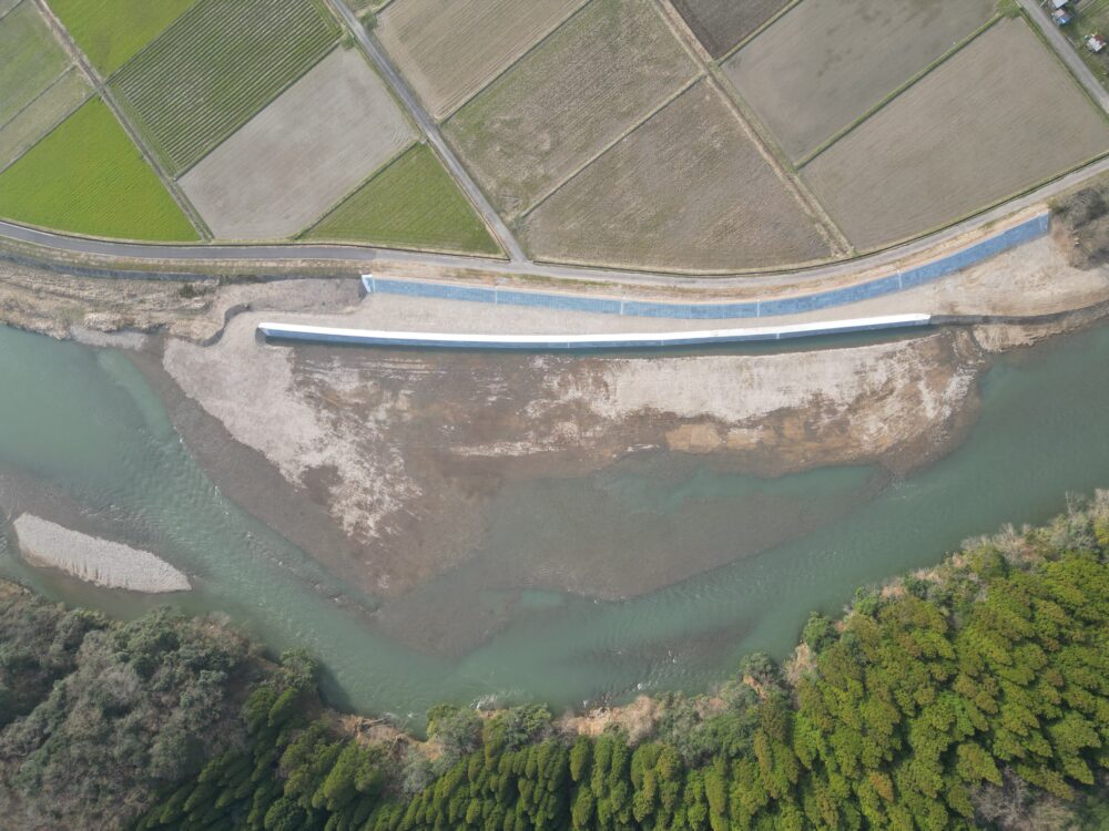 大雨による出水により損傷した河川敷や護岸の復旧工事を行いました。